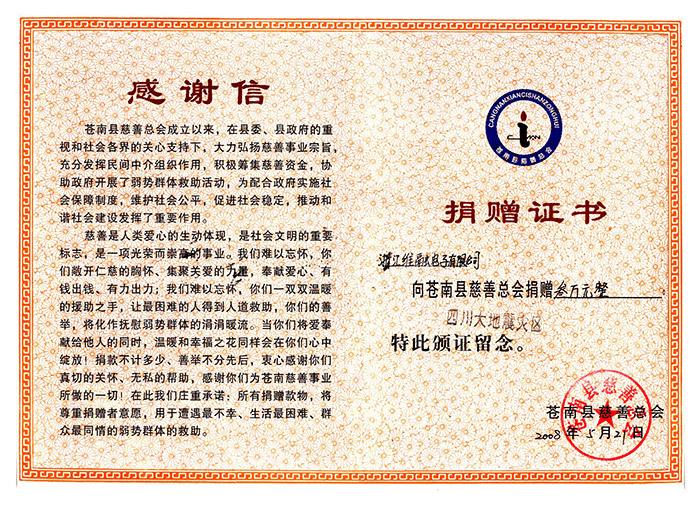 08年維融-捐贈證書10年玉樹地震捐款