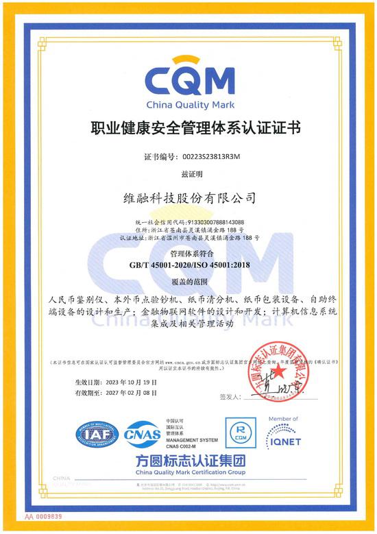 職業(yè)健康安全管理體系CQM認(rèn)證證書