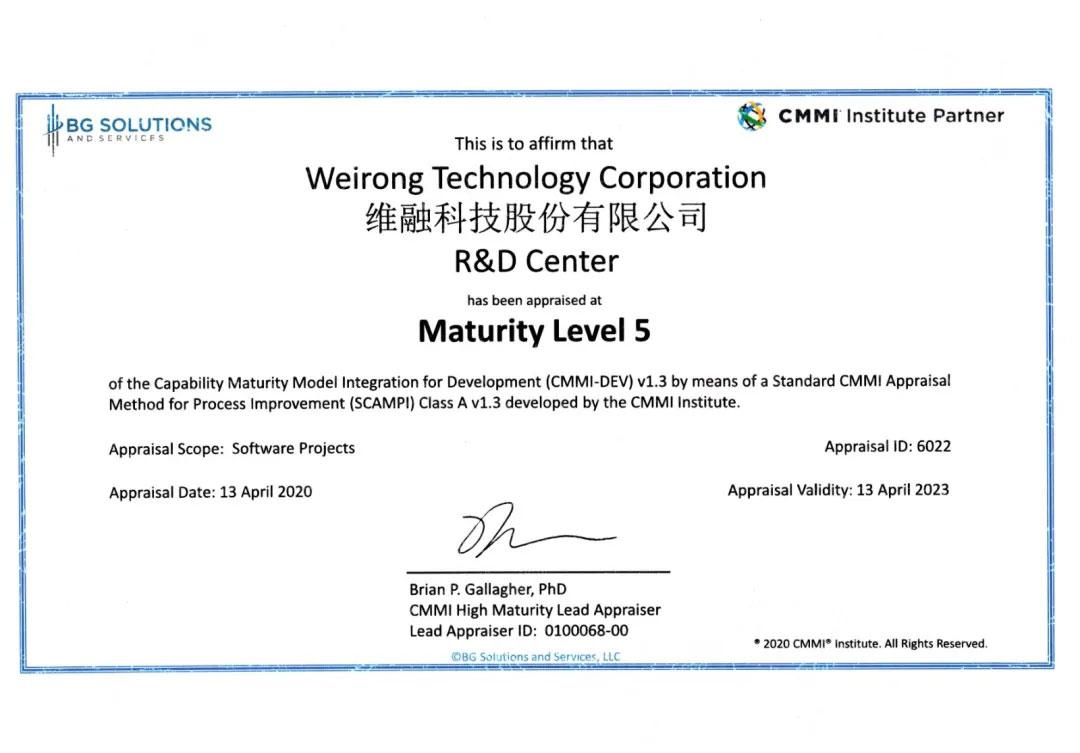 2020年4月13日,維融科技股份有限公司正式通過(guò)CMMI5級(jí)評(píng)估認(rèn)證,標(biāo)志著公司在軟件過(guò)程組織、技術(shù)研發(fā)、項(xiàng)目管理、方案交付等方面達(dá)到了國(guó)際先進(jìn)水平。?